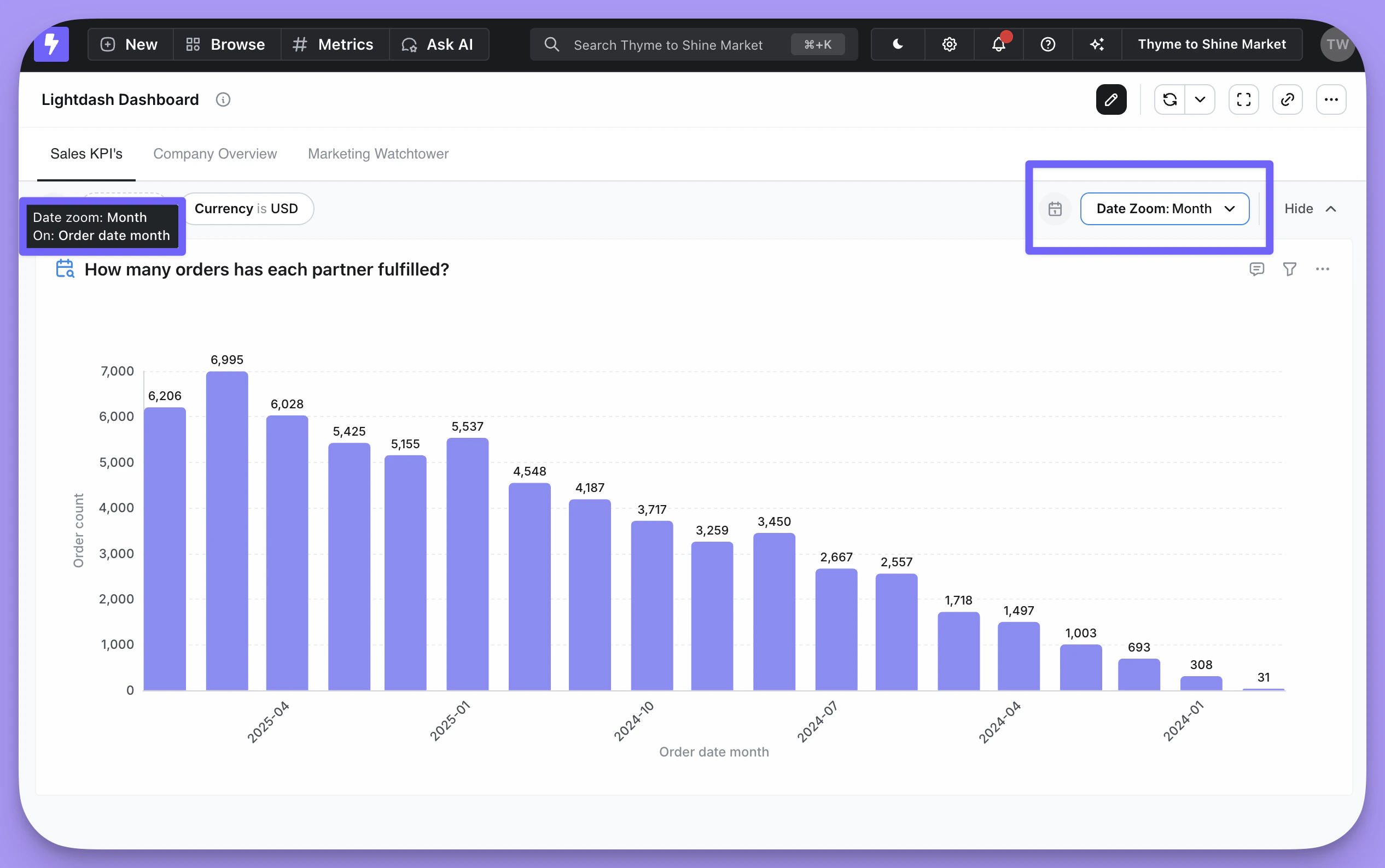 Date zoom lets you change the date granularity (Day, Week, Month, etc.) of all time-based charts on a dashboard at once—without editing individual charts.