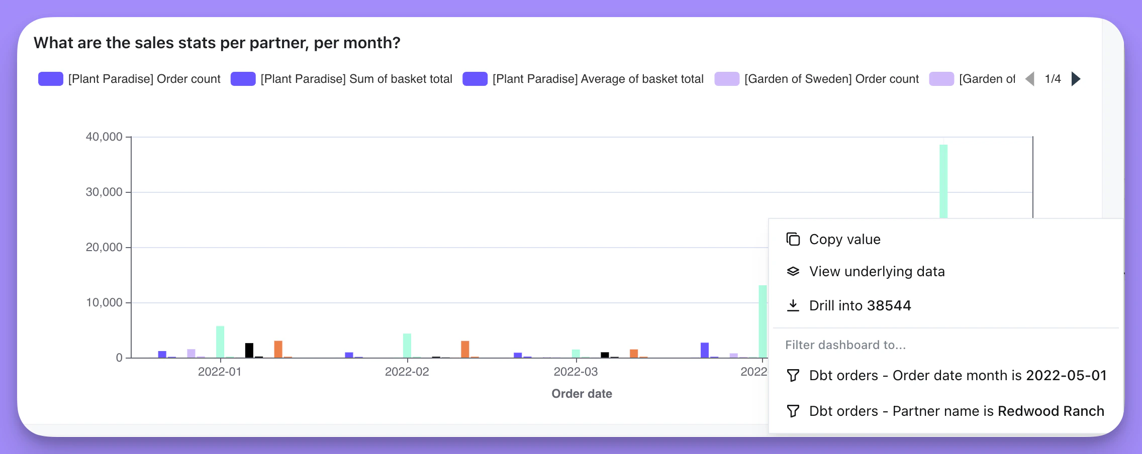 I have a chart with Sum of basket total (a Metric) per Partner, per month. As you can see, there’s a high spike in sales for one of the partners in the month of May. I want to understand why this spike happened. To do this, I click on the data point in my chart, then clickDrill into in the action menu: