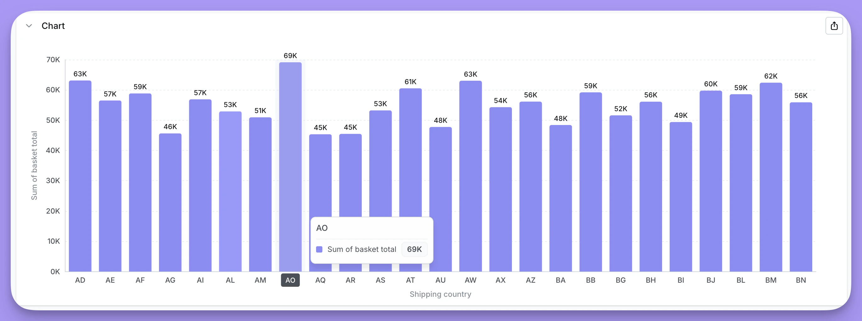 Open in new tab and see a chart with my Metric, grouped by Shipping country. Now I can uncover where this spike in sales is coming from