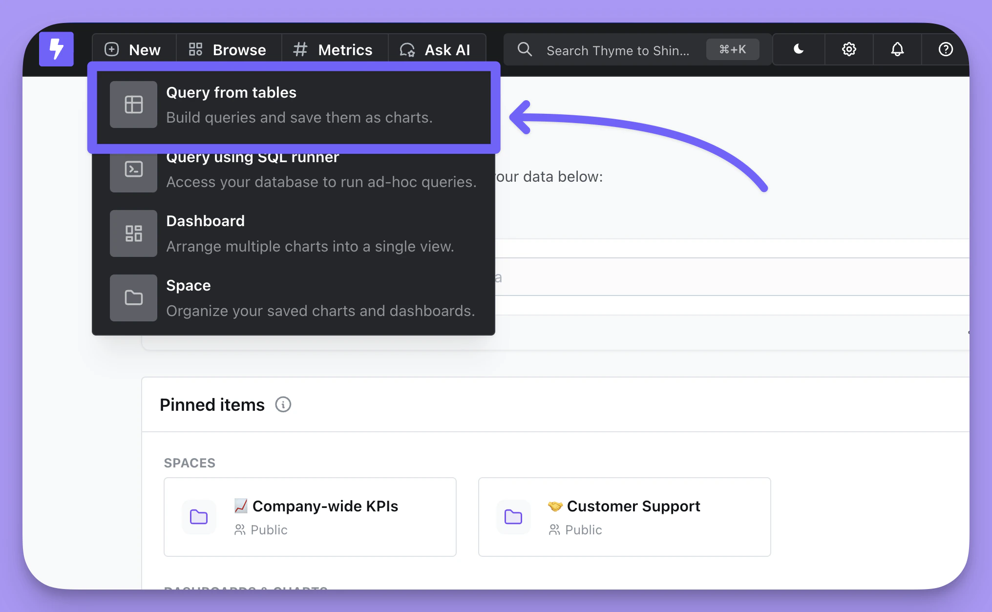 To start a new query, click on [+] New —> Query from tables, then select the table that you want to explore.