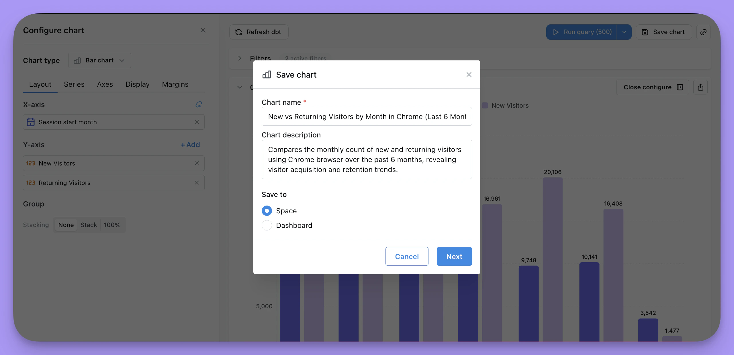 To save a chart, click the Save chart button at the top of the page, then give your chart a useful name and description. You’ll have the option to save the chart to a Dashboard or a Space. Once you save a chart, it unlocks these useful features: