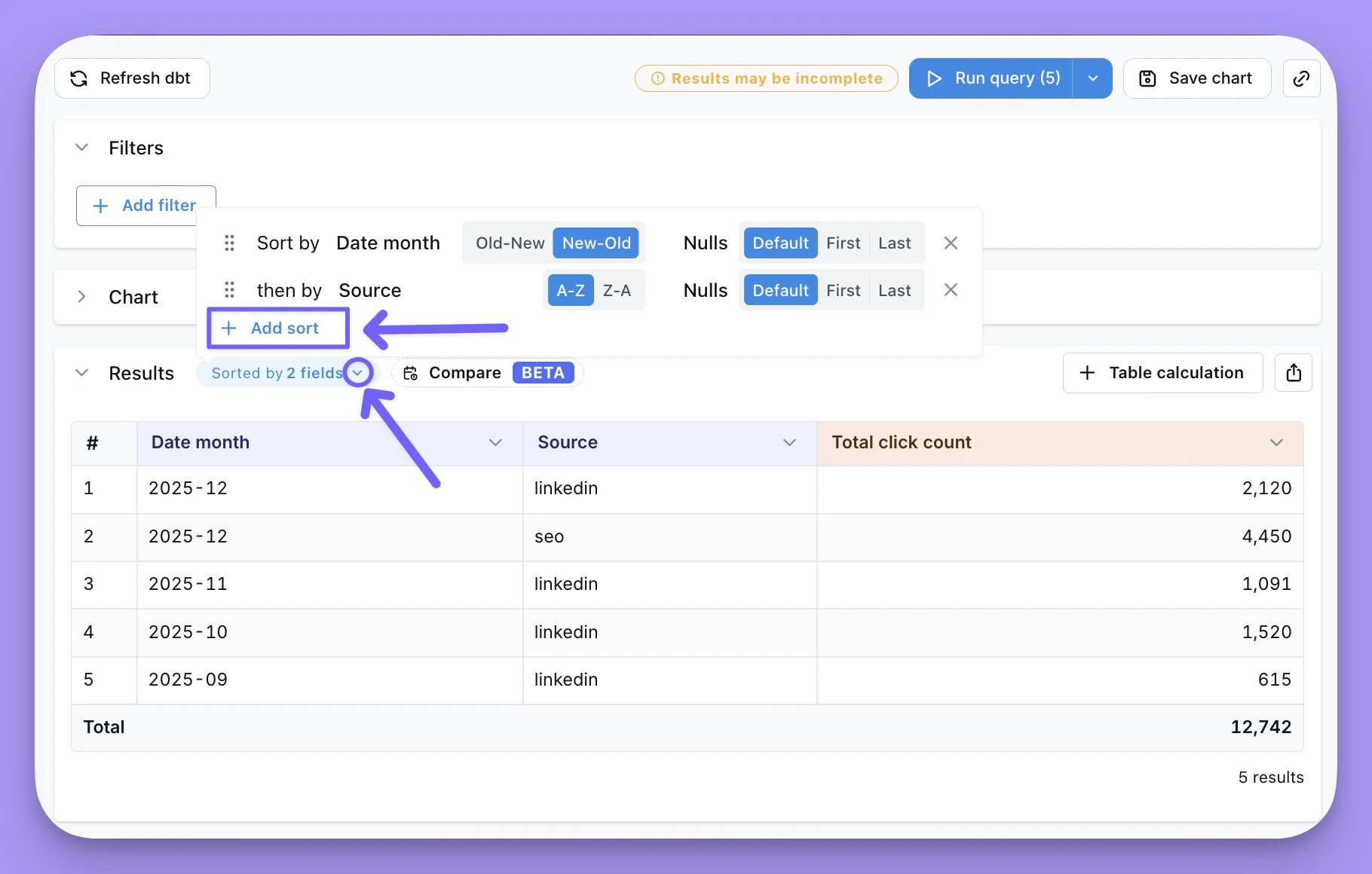 If you want to sort by multiple fields, click the blue pill that displays the current sort, then choose + Add sort.