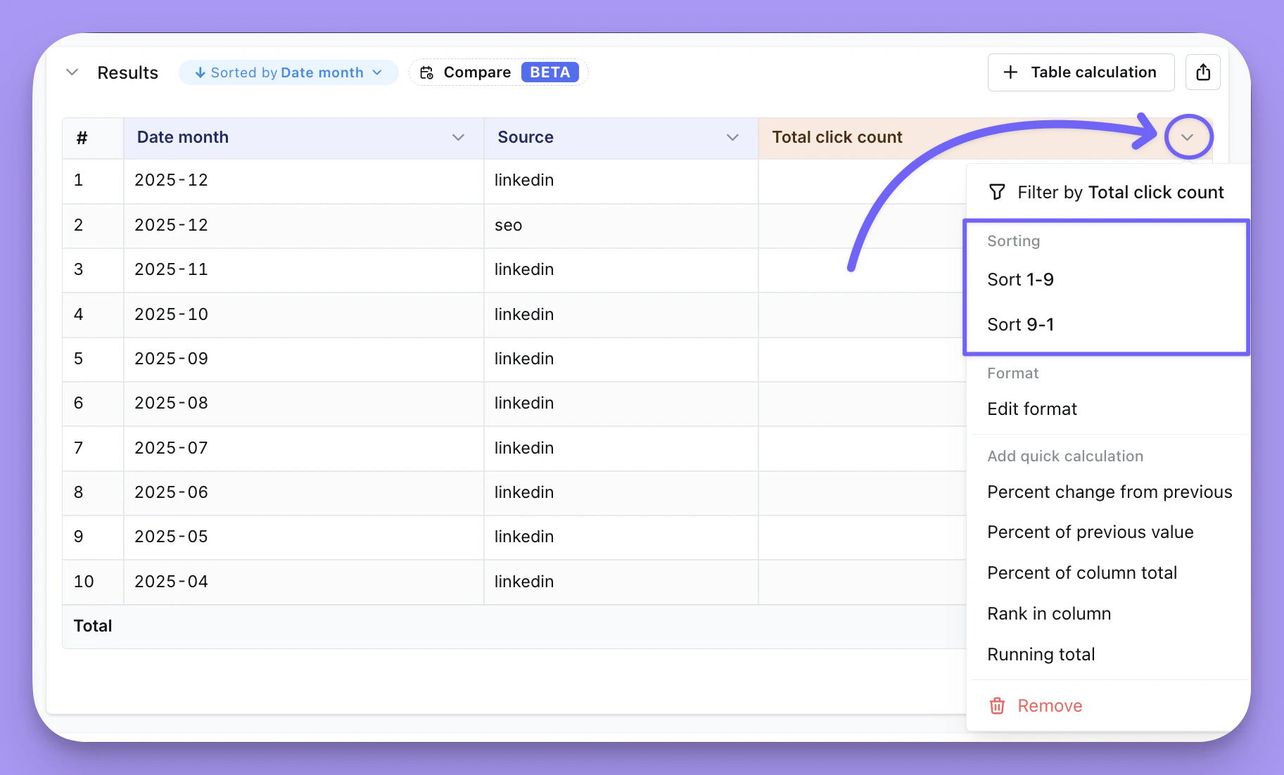 4. Change the order of a column’s sort using the toggle next to the field name in the sort menu.