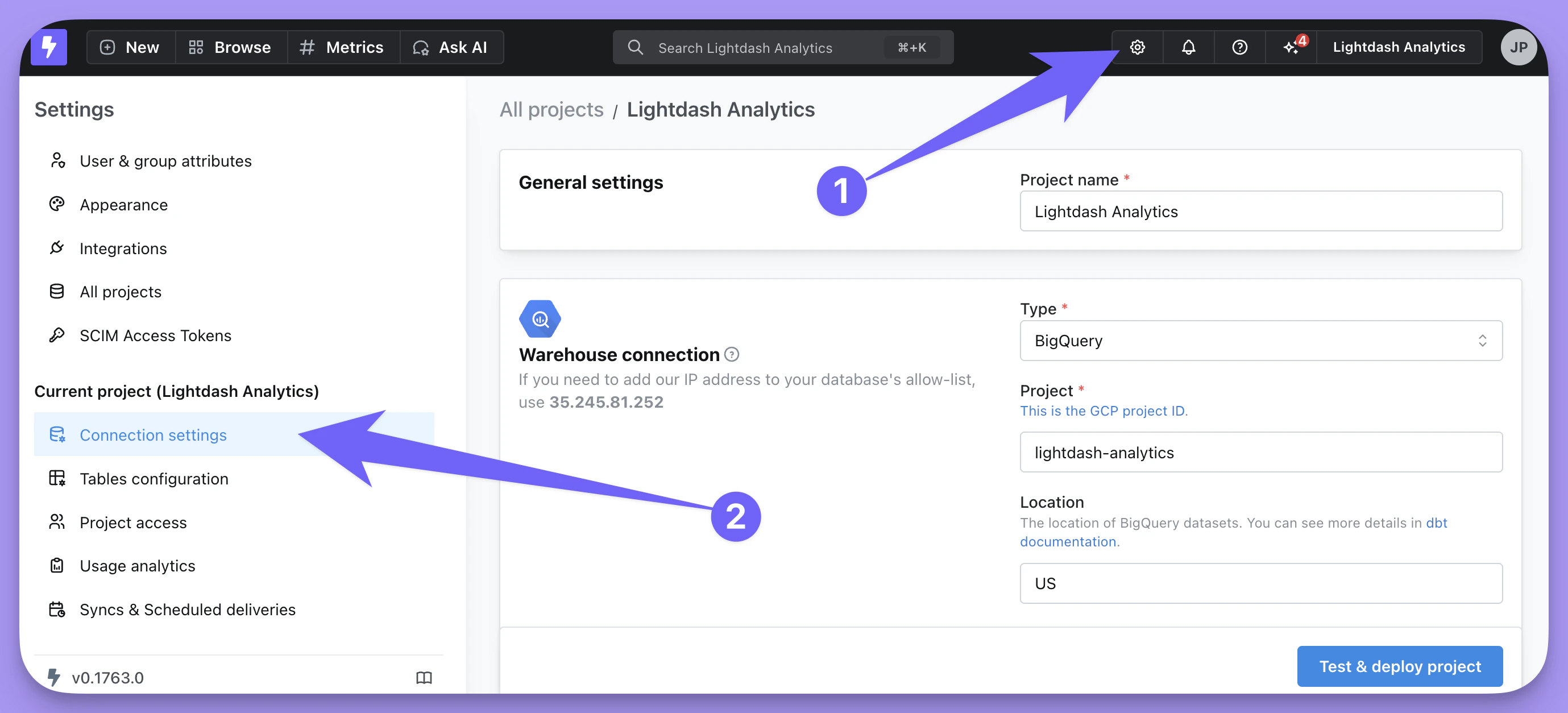 To update an existing connection, go to Project settings by clicking on the gear icon in the top-right navigation.