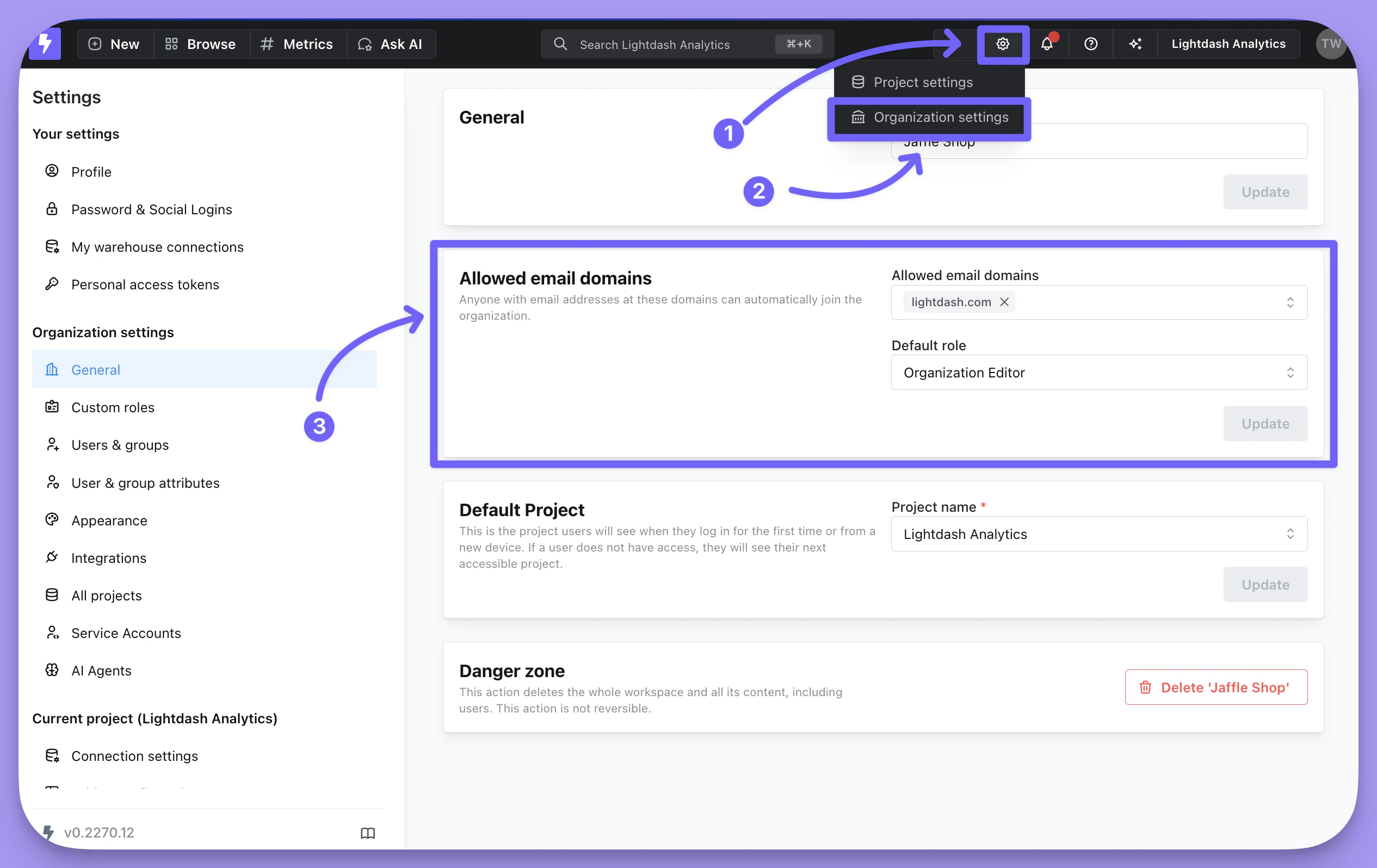 In the Allowed email domains panel, enter the email domain(s) you want to be able to automatically join your organization (e.g. here, we’ve added lightdash.com). Generic email domains like gmail.com or hotmail.com are not accepted. You can then select the access that you want these users to have by default. The organization Admin can always update a user’s permissions after they’ve joined!