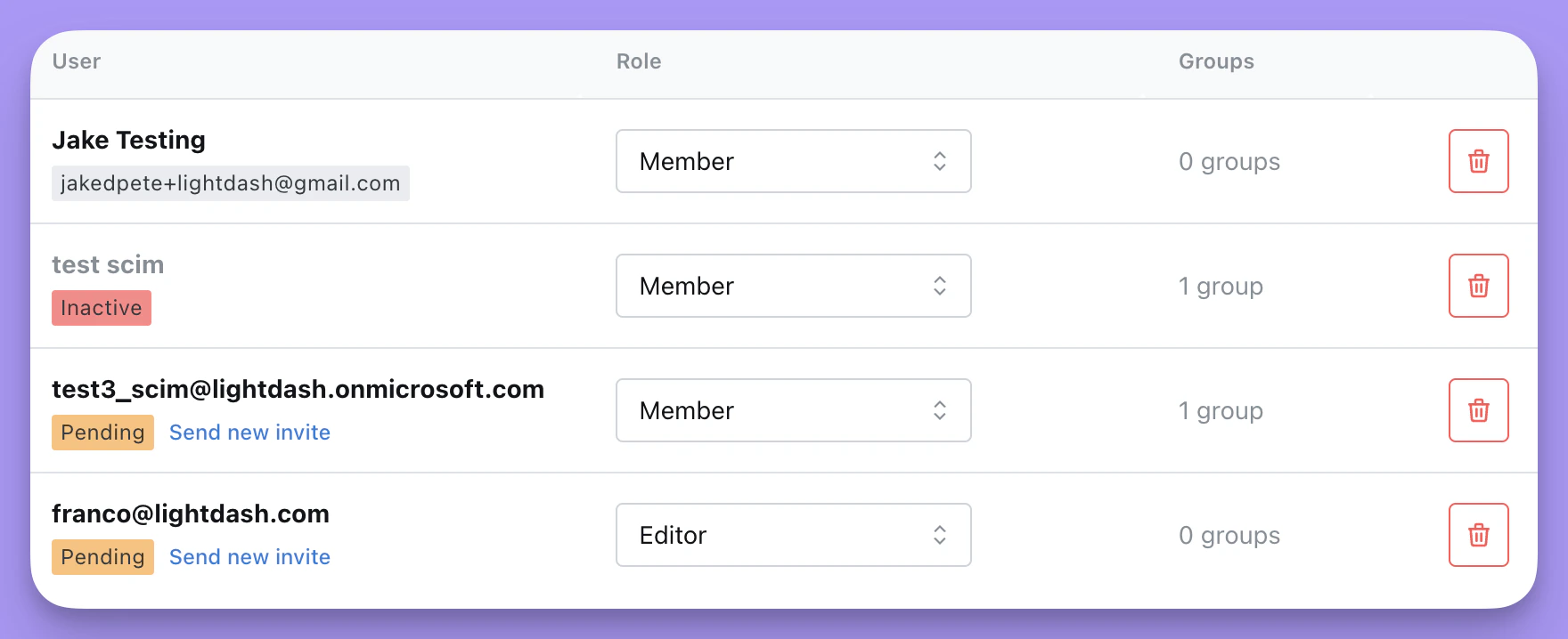 You then need to input the email address of the user you want to invite and select the role you want to assign them. Read more about user roles and permissions in Lightdash here. Once you hit Send invite, we’ll send an email to the new user with their invite link.