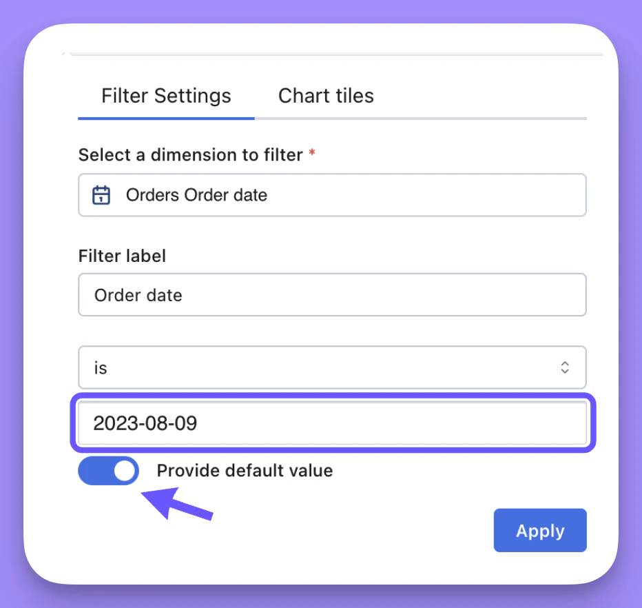 Here’s another example using a date filter: If my original saved chart was filtered to only include orders completed on or after April 3rd, 2024. But, I add a date filter to my dashboard to include orders completed on or after August 1st, 2024, then the dashboard filter would override the saved chart filter and I’ll end up with the chart filtered by orders completed on or after August 1st, 2022.