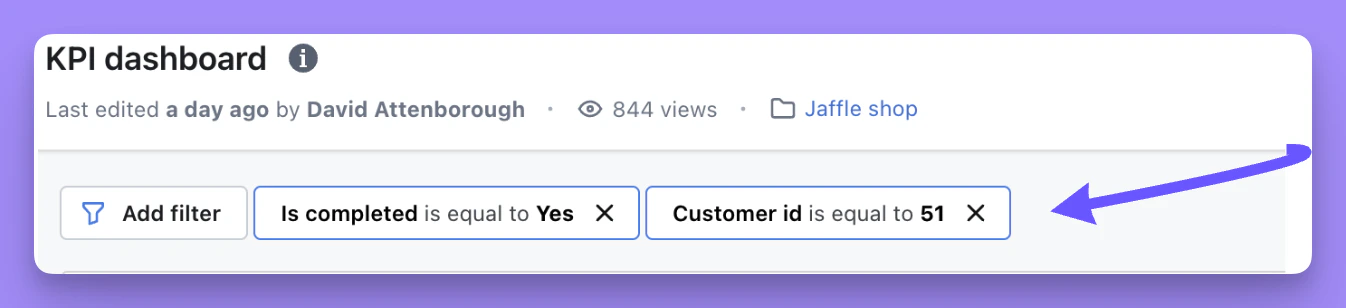 Add filters button on a dashboard. Head to edit mode and toggle the eye icon next to the Add filters dropdown to hide or show it. When hidden, end users are restricted to only using filters that have been specifically set up in dashboard edit mode.Adding temporary filters using the add filters button