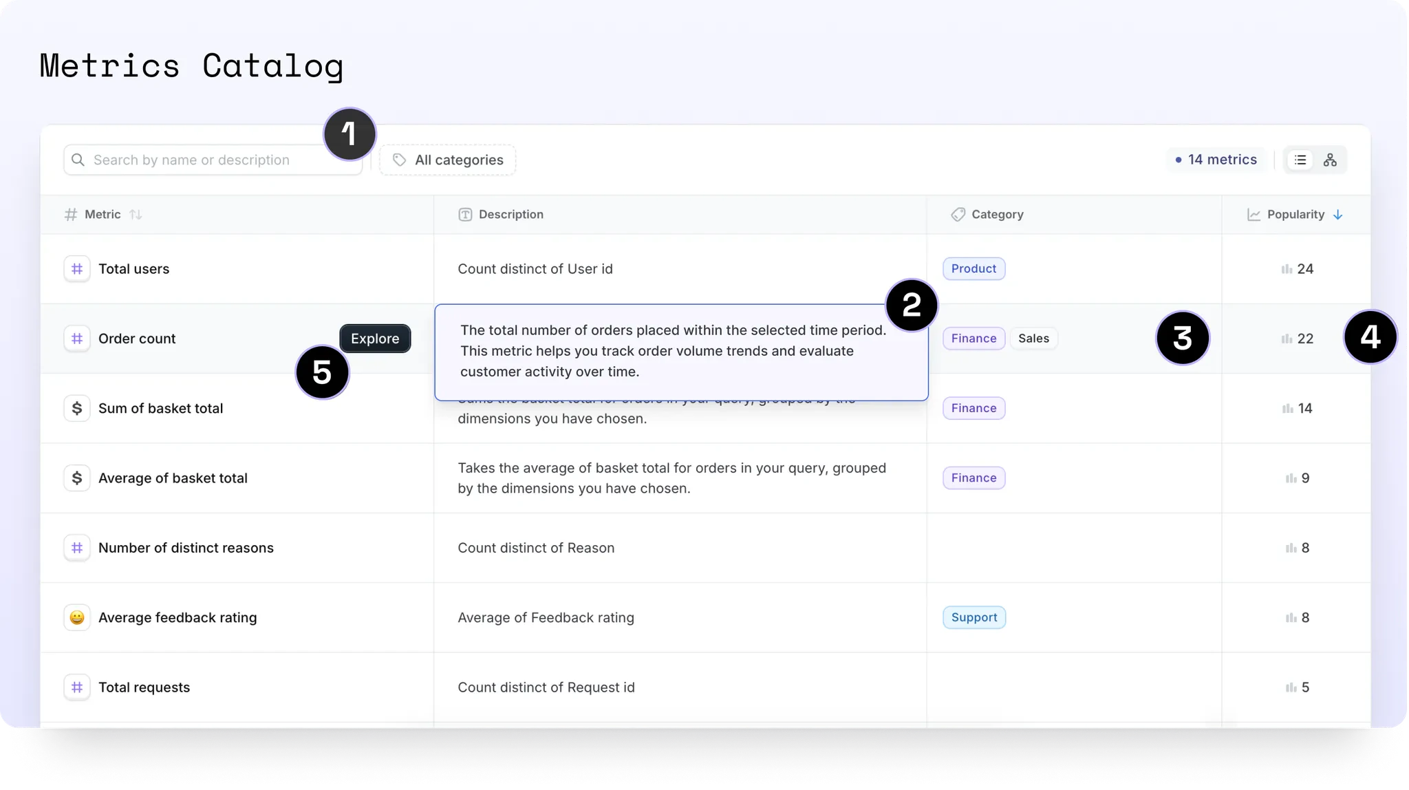 - Search: Easily find metrics by their names or .yml descriptions using the searchbar.