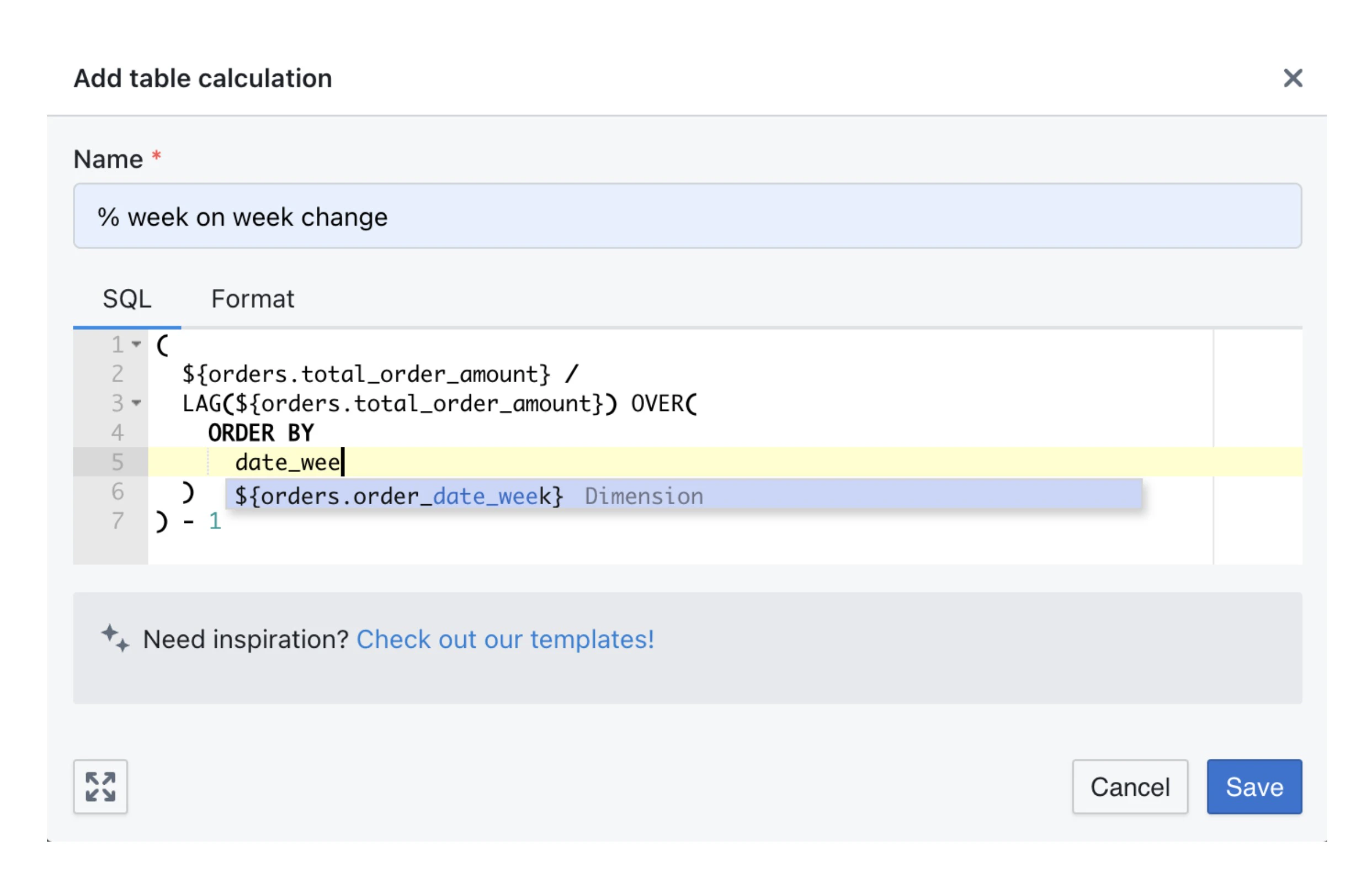 Your table calculation is defined using raw SQL that you write up in this pop up box. If you’re not sure what to write here, you can check out some of our table calculation SQL templates. To reference the metrics and dimensions in your results table, you can either use the autocomplete, or you can manually write the full field name using the format${table_name.field_name}.