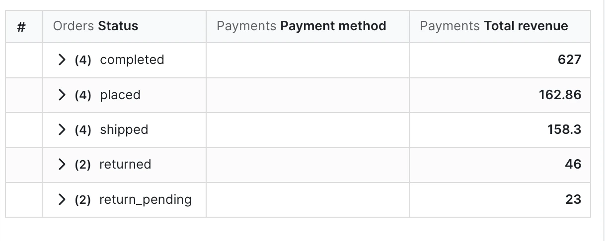 When you enable Show metrics as rows, each pivoted dimension value creates only one column, regardless of how many metrics you have. The metrics are displayed as separate rows instead. For example, if you have partner_name as a row dimension (with 5 partners), pivot by order_date_month (with 12 months of data), and have 3 metrics: