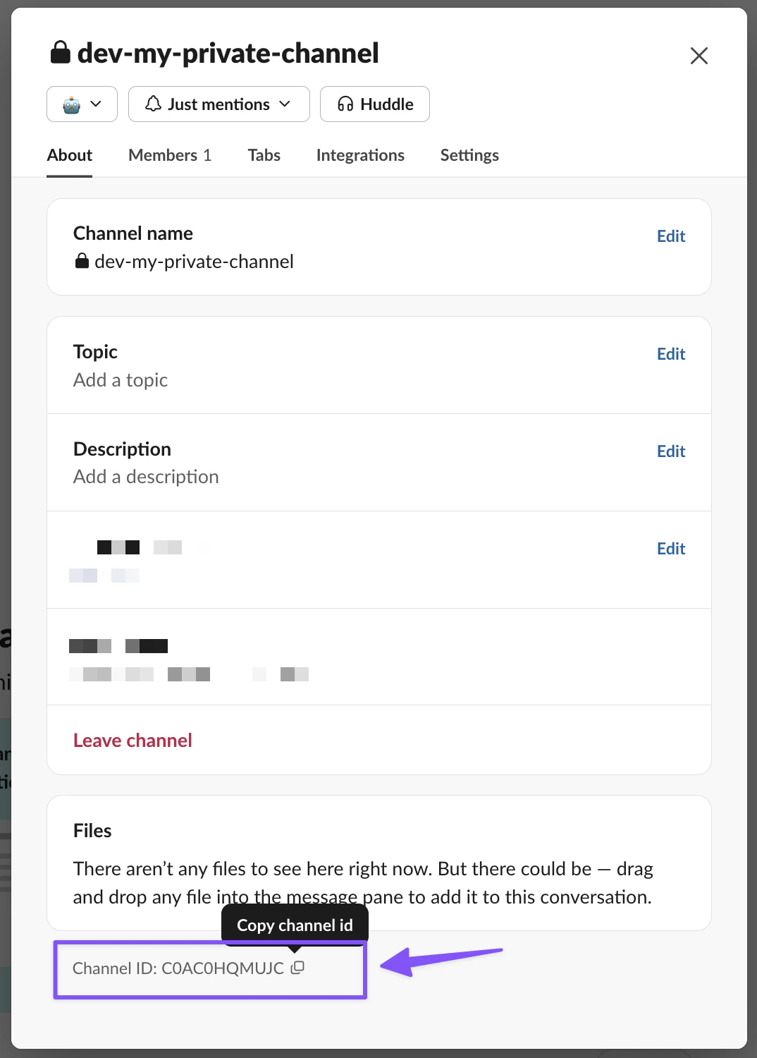 • Looking up the channel by ID - You can find your channel ID in Slack by right-clicking on the channel name, selecting “View channel details”, then copying the Channel ID from the bottom of the modal.
