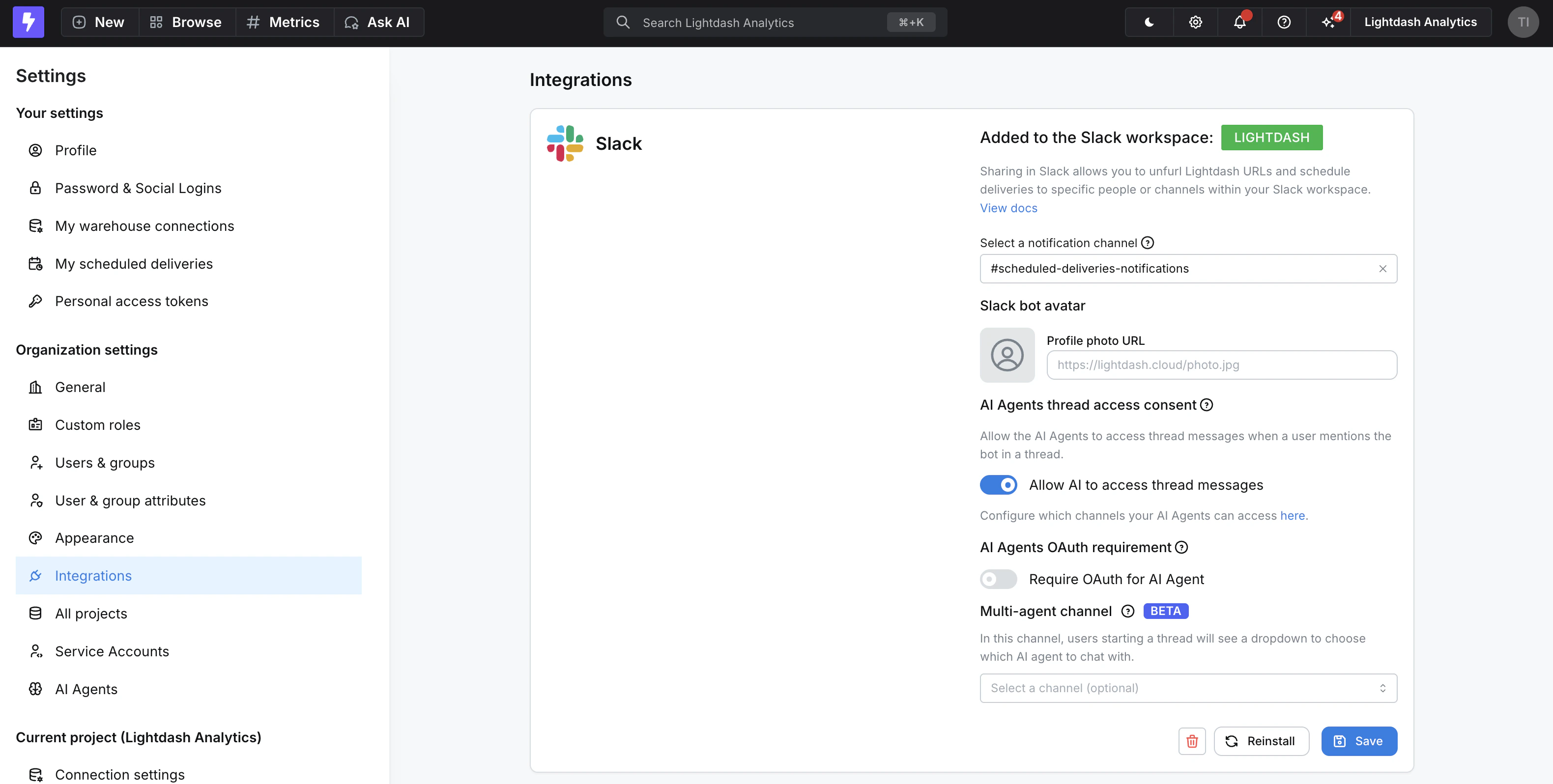 • Each Slack user must authenticate with Lightdash before using the AI agent